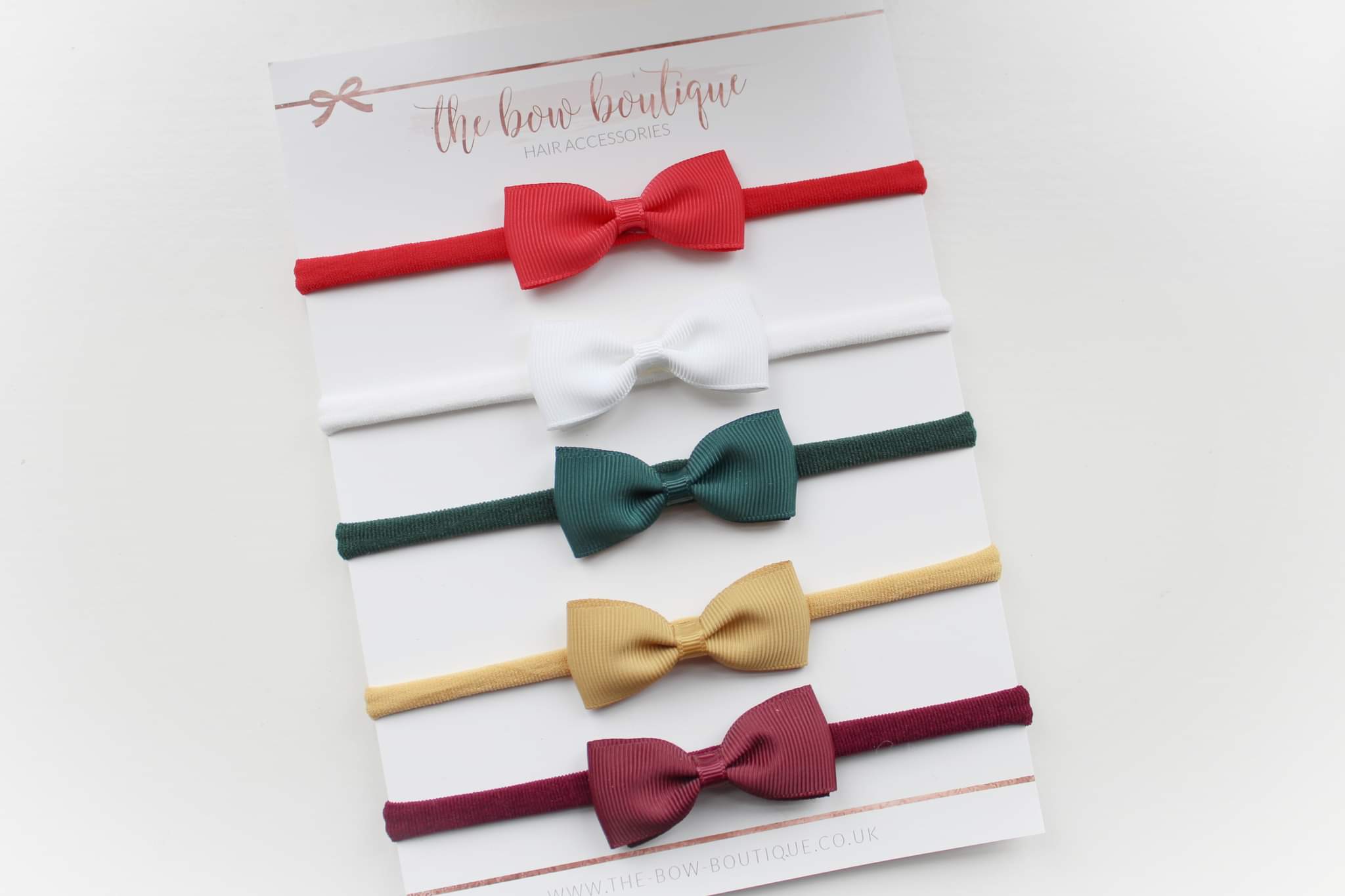 Bow colour – Red, white, green, mustard and burgundy.
